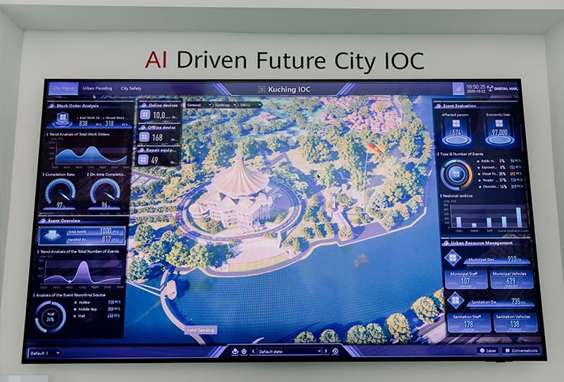 在聯(lián)合展臺上,數(shù)字冰雹與華為共同展示的智慧城市 IOC 應(yīng)用 成為了矚目的中心。該平臺以高精度、全要素的數(shù)字孿生技術(shù)為核心,1:1復(fù)刻了砂拉越的城市風(fēng)貌、基礎(chǔ)設(shè)施與動態(tài)運行數(shù)據(jù),構(gòu)建了一個虛實映射、實時交互的“城市數(shù)字體”。
