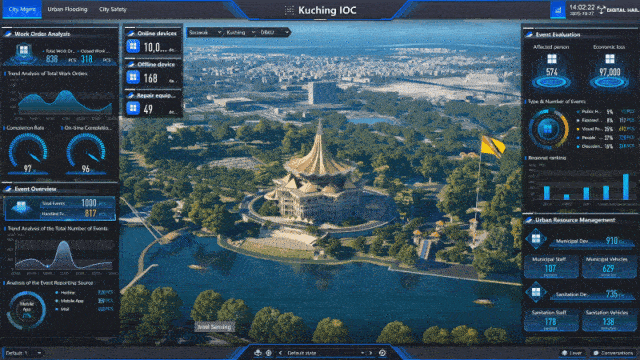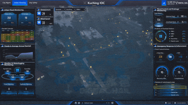 砂拉越地區(qū)雨季降水集中,內(nèi)澇防治是城市安全的重要一環(huán)。數(shù)字孿生 IOC 能夠接入實時氣象數(shù)據(jù)、水文監(jiān)測數(shù)據(jù),并結(jié)合城市地形、管網(wǎng)模型,能夠動態(tài)模擬 暴雨情況下城市各區(qū)域的積水情況、淹沒范圍與演進趨勢。這不僅能幫助相關(guān)部門提前發(fā)布預(yù)警、調(diào)度排澇資源,更能為城市排水系統(tǒng)的長遠規(guī)劃與改造提供科學(xué)依據(jù)。